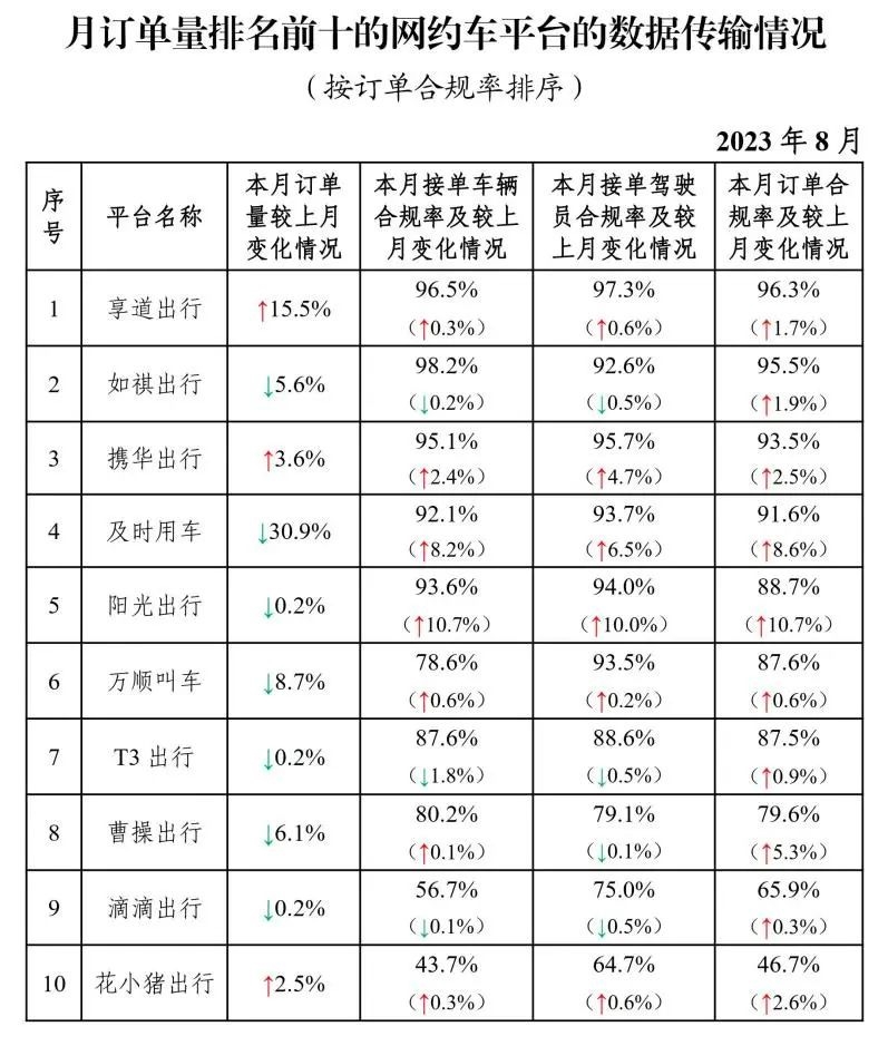 据了解,8月份,网约车监管信息交互系统共收到订单信息8.24亿单,环比上升0.5%。在订单量前10名的平台中,按订单合规率(指驾驶员和车辆均获得许可的订单量占比)从高到低的分别是享道出行、如祺出行、携华出行、及时用车、阳光出行、万顺叫车、T3出行、曹操出行、滴滴出行、花小猪出行。本月订单合规率增长前3名的依次是阳光出行、及时用车、曹操出行;其中,面向乘客、与网约车平台公司共同提供服务的平台(俗称“聚合平台”)完成2.28亿单,按订单合规率由高到低的分别是滴滴出行、高德打车、美团打车、花小猪出行、百度打车、腾讯出行、携程用车。