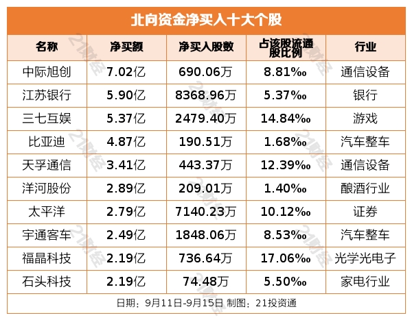 个股方面,北向资金净买入中际旭创(300308.SZ)、江苏银行(600919.SH)、三七互娱(002555.SZ)、比亚迪(002594.SZ)、天孚通信(300394.SZ)居前,其中,中际旭创被净买入7.02亿元,江苏银行被净买入5.90亿元,三七互娱被净买入5.37亿元,比亚迪被净买入4.87亿元,天孚通信被净买入3.41亿元。