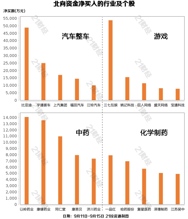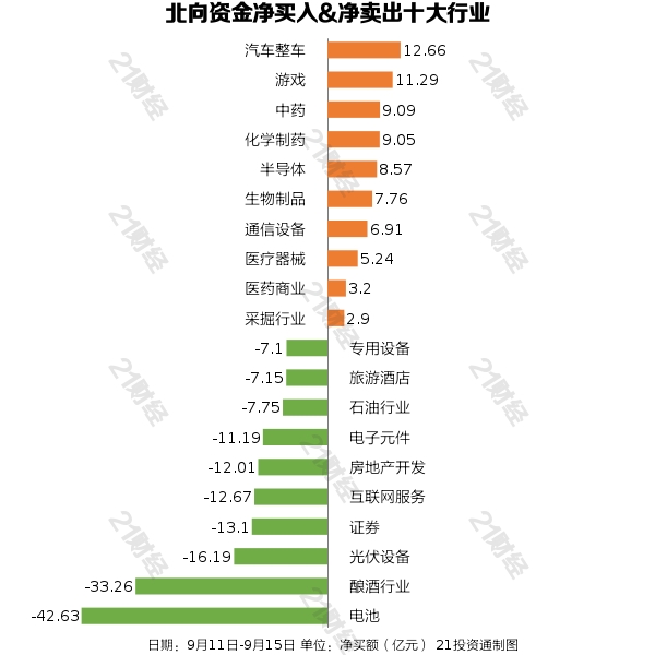从净买入金额来看,北向资金增持了36个行业,其中汽车整车居首,净买入金额达12.66亿元,其次是游戏行业,净买入11.29亿元。北向资金减持了64个行业,其中电池最多,净卖出金额达42.63亿元,其次是酿酒行业,净卖出33.26亿元。