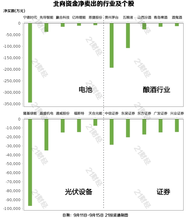 北向资金净卖出宁德时代(300750.SZ)、贵州茅台(600519.SH)、五粮液(000858.SZ)、隆基绿能(601012.SH)、京东方A(000725.SZ)居前,其中,宁德时代被净卖出34.45亿元,贵州茅台被净卖出19.36亿元,五粮液被净卖出10.83亿元,隆基绿能被净卖出9.70亿元,京东方A被净卖出9.13亿元。