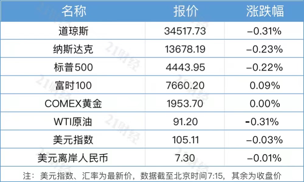 纽约股市三大股指19日下跌。截至当天收盘,道琼斯工业平均指数比前一交易日下跌106.57点,收于34517.73点,跌幅为0.31%;标准普尔500种股票指数下跌9.58点,收于4443.95点,跌幅为0.22%;纳斯达克综合指数下跌32.05点,收于13678.19点,跌幅为0.23%。
