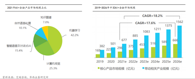 具体到中国市场,据艾瑞咨询测算,2021年AI+金融核心市场规模达到296亿元,带动相关产业规模677亿元,到2026年,核心市场规模达到666亿元,CAGR为17.6%,带动相关产业规模1562亿元,CAGR为18.2%。