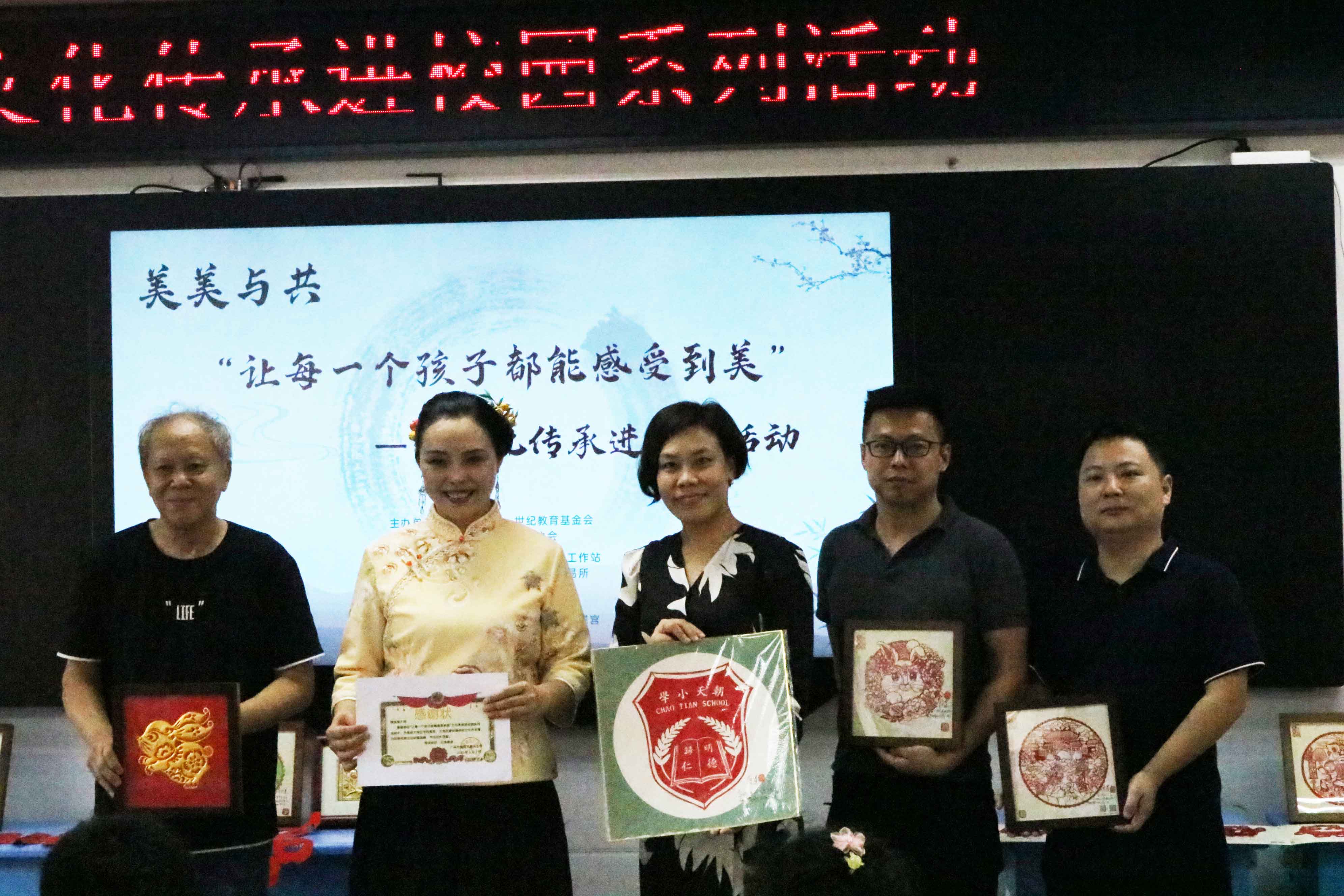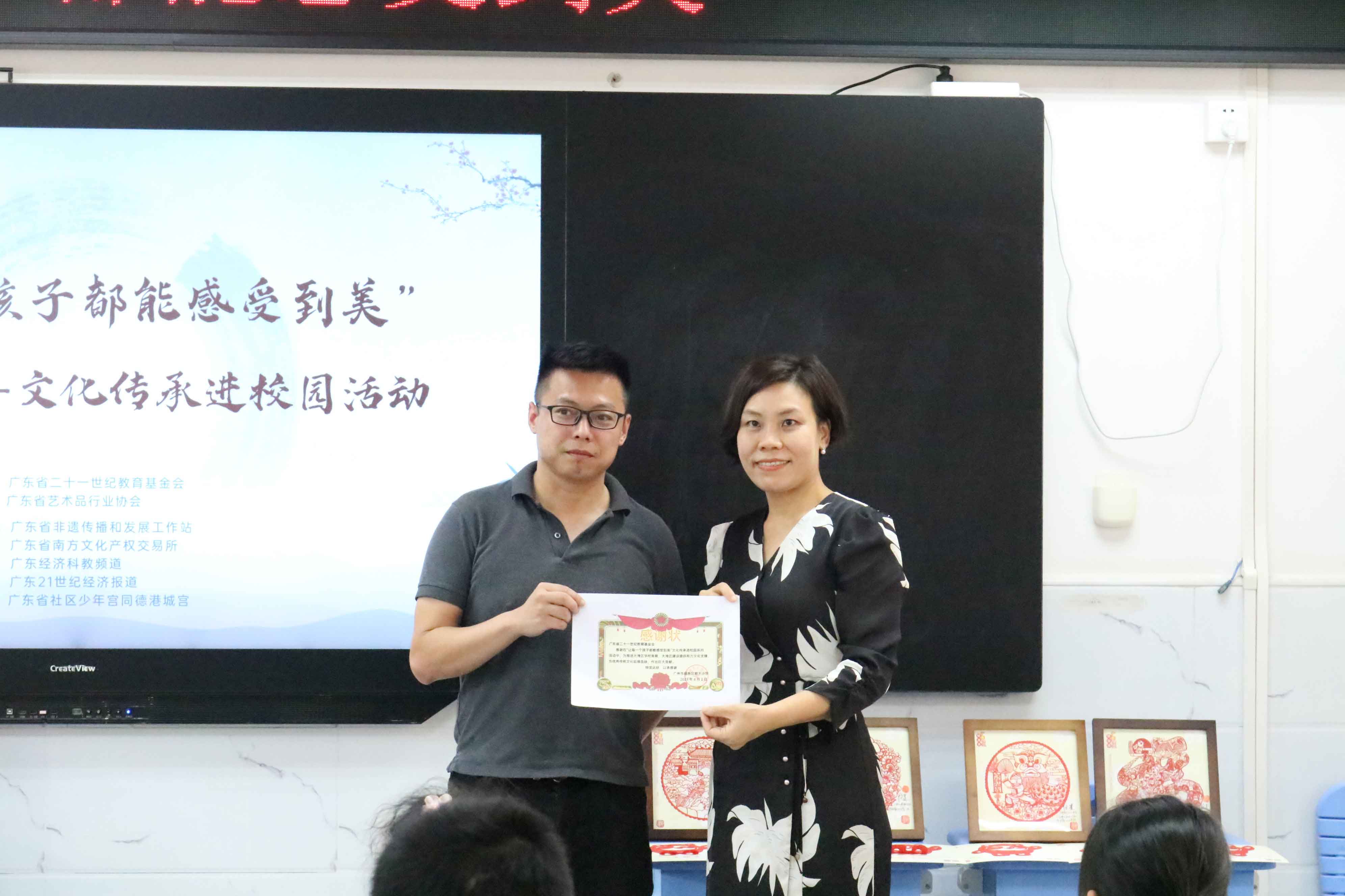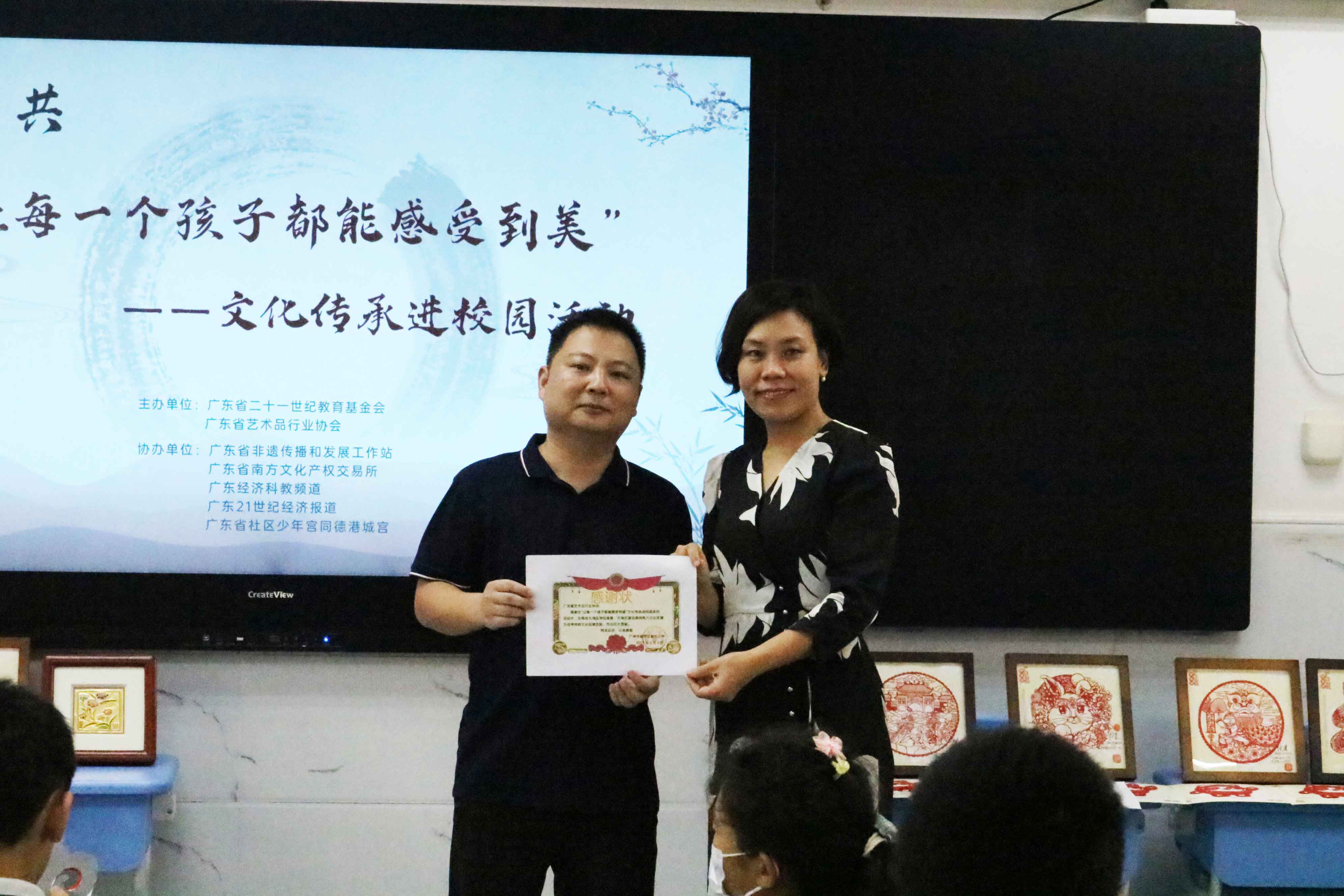 活动最后,饶宝莲向朝天小学捐赠了专门创作的《朝天小学校徽》的剪纸作品,袁慧副校长给饶宝莲、广东省二十一世纪教育基金会、广东省艺术品行业协会赠送了感谢状。