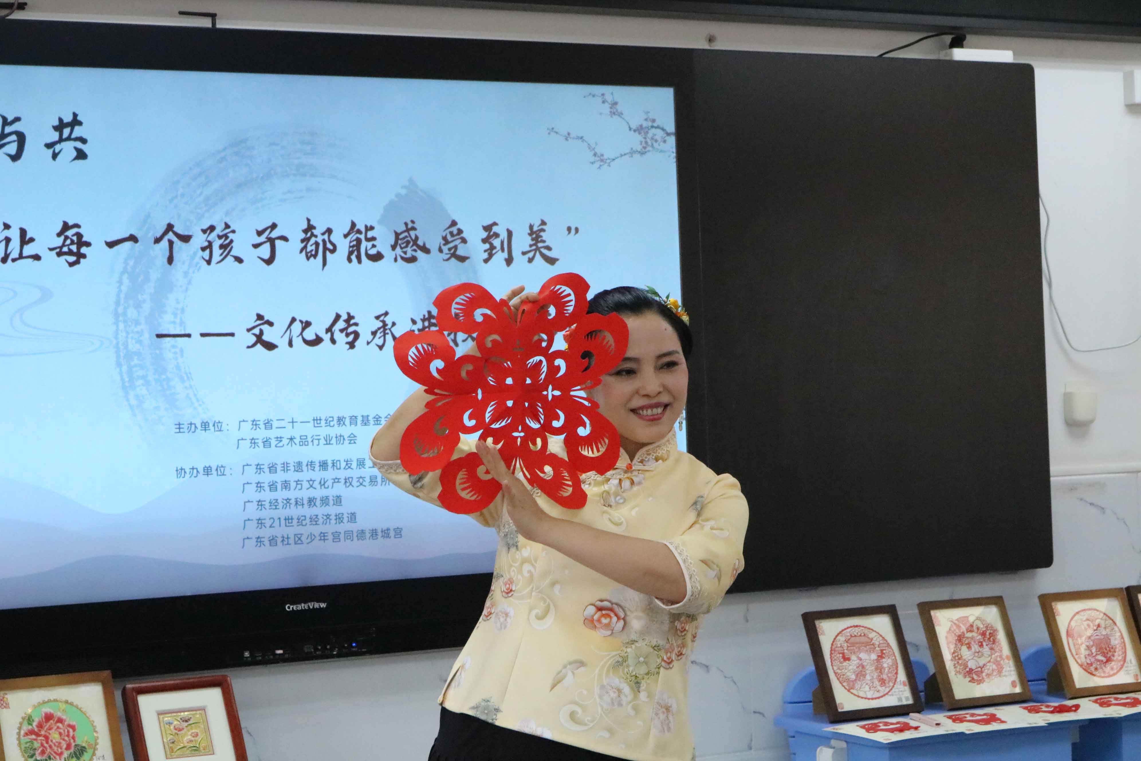 学非遗,玩剪纸,听故事……为传承非遗文化、丰富学生校园生活,6月2日,由广东省二十一世纪教育基金会、广东省艺术品行业协会主办,广东省非遗传播和发展工作站、广东省南方文化产权交易所、21世纪经济报道、广东经济科教频道、广东省社区少年宫同德港诚宫协办的“让每一个孩子都能感受到美”文化传承进校园活动第一站在广州市越秀区朝天小学开展。