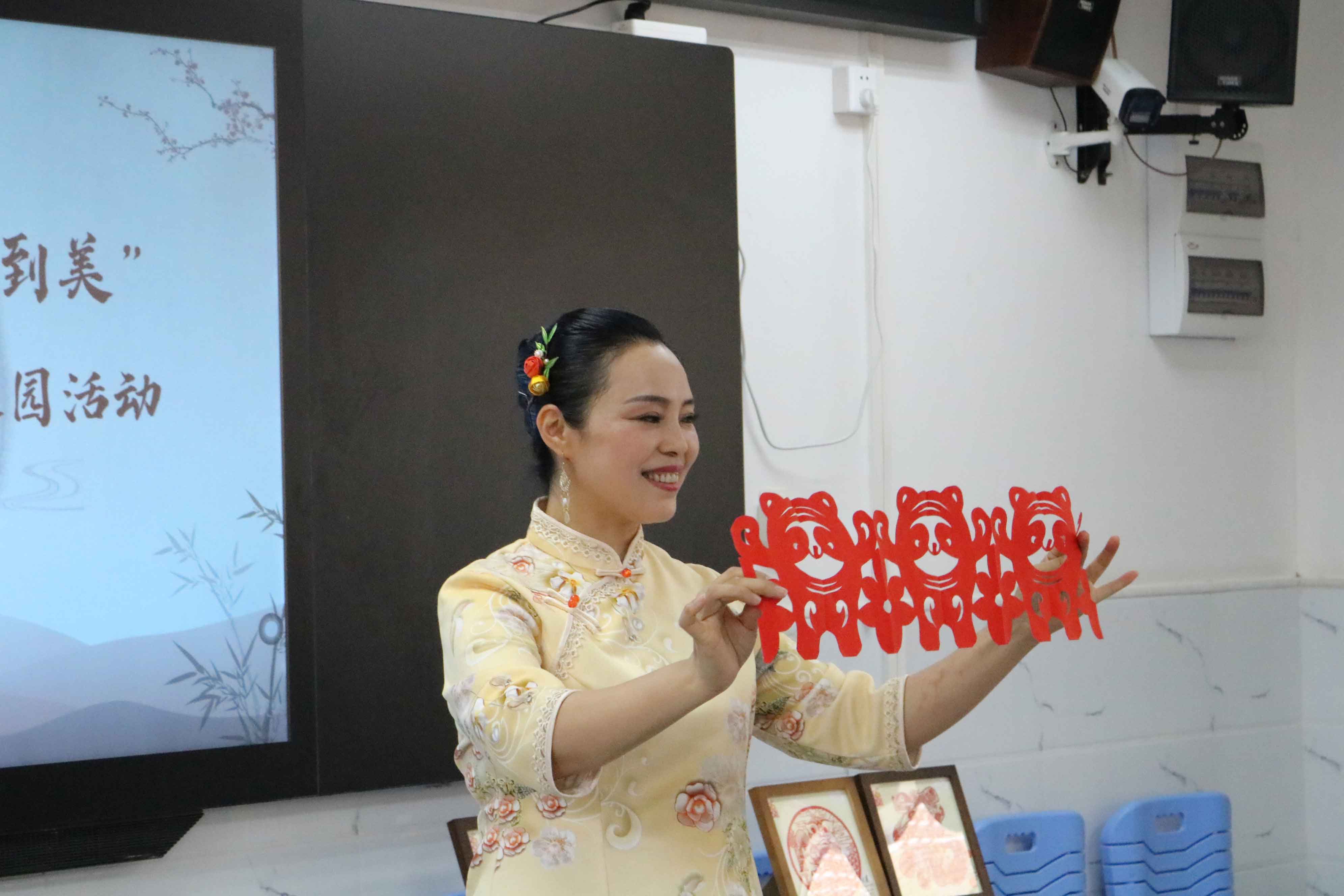 活动伊始,饶宝莲为同学们简要介绍了中国剪纸的历史、剪纸的特点、种类、题材特征,以及剪纸的形式、技巧等方面,对剪纸艺术进行了生动的诠释;同时分享了自己精美的剪纸作品,激发了孩子们学习剪纸的兴趣。