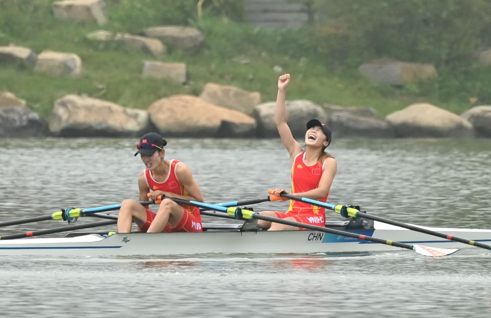 在杭州亚运会赛艇女子轻量级双人双桨决赛中,中国组合邹佳琪/邱秀萍以7分06秒78的成绩夺得冠军,斩获本届亚运会首金。新华社记者 江汉 摄