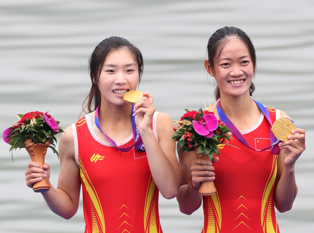 24日上午,在富阳水上运动中心进行的女子轻量级双人双桨决赛中,中国队的邹佳琪/邱秀萍以绝对优势夺得冠军。这是杭州亚运会开赛以来产生的首枚金牌,也是中国代表团连续六届在亚运会中摘得首金。