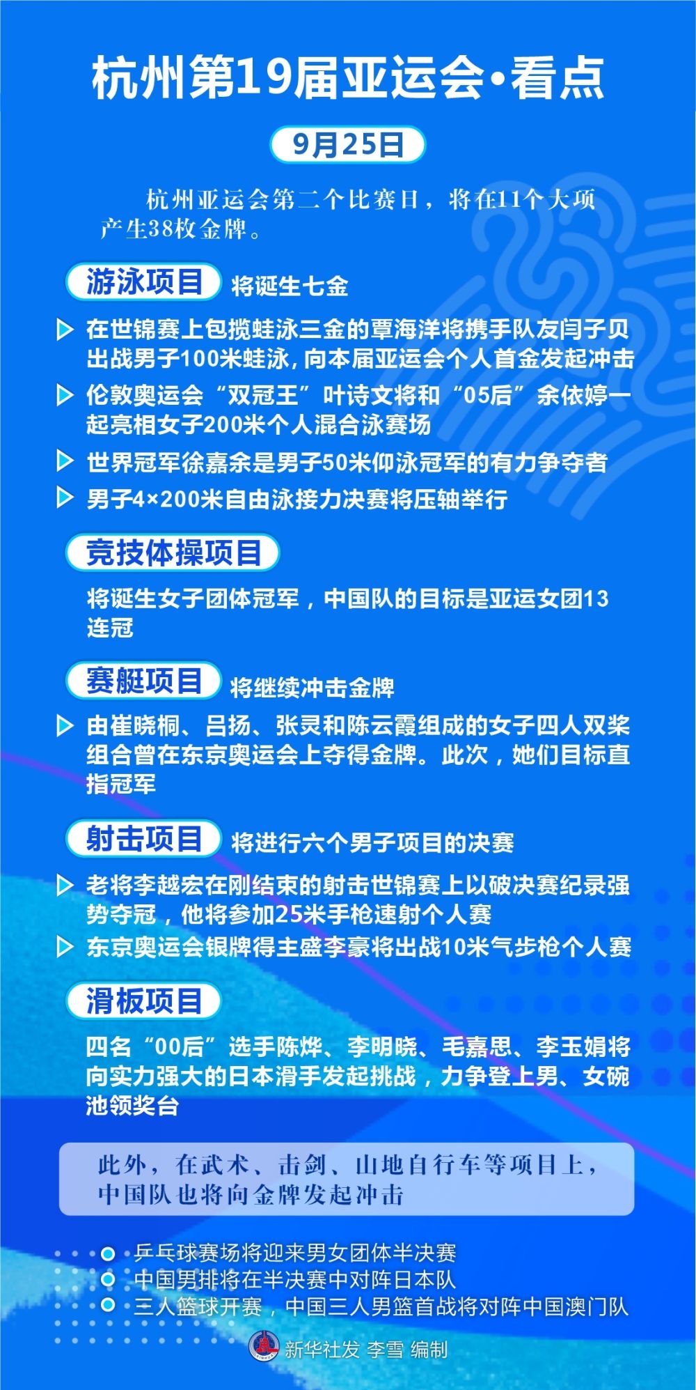 9月25日是杭州亚运会开幕后第二个比赛日,将在11个大项产生38枚金牌。新“蛙王”覃海洋和连续12届亚运会体操女团冠军中国队都将全力以赴,捍卫冠军荣耀。