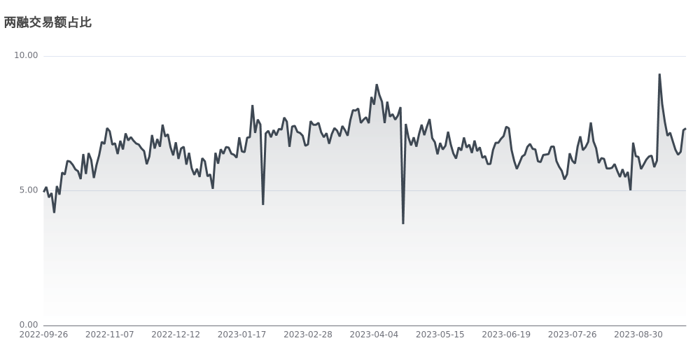 今日该指标值为7.32%,目前该指标处于近一年较高区间,认为当前A股市场相对较强。反映场内投资者借钱炒股的杠杆水平,该指标越高说明杠杆水平越高,即投资者认为当前市场较强,反之则说明投资者认为市场相对较弱,因而与上证指数存在较强的正相关性。