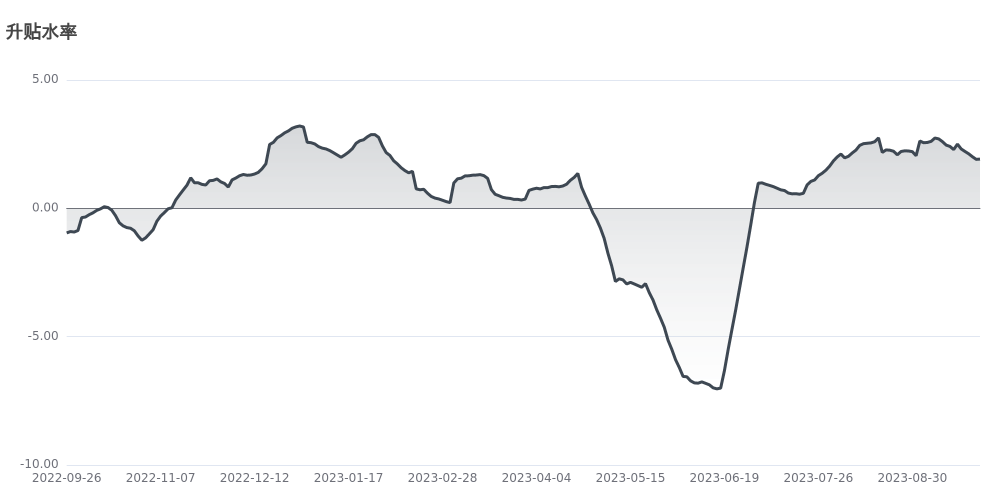 今日该指标值为1.92%,目前该指标处于近一年较高区间,说明投资者认为当前A股市场相对较强。反映期货市场投资者对市场的看法,该指标越高说明投资者认为当前市场较强,越低则说明认为市场相对较弱,因而与上证指数正相关。
