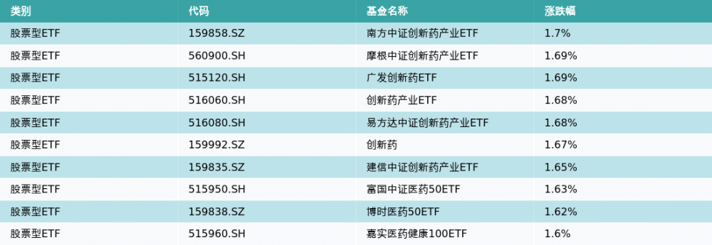 9月25日,股票型ETF涨幅最高的3支ETF及其收益率分别为:南方中证创新药产业ETF(1.7%)、摩根中证创新药产业ETF(1.69%)、广发创新药ETF(1.69%)。涨幅前10详情见下表: