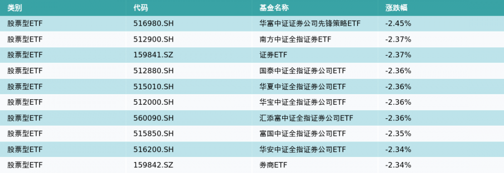 9月25日,股票型ETF跌幅最大的3支ETF及其收益率分别为:华富中证证券公司先锋策略ETF(-2.45%)、南方中证全指证券ETF(-2.37%)、证券ETF(-2.37%)。跌幅前10详情见下表: