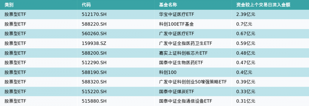 9月25日,股票型ETF资金流入最多的3支ETF及其流入金额分别为:华宝中证医疗ETF(流入2.39亿元)、科创100ETF基金(流入0.7亿元)、广发中证医疗ETF(流入0.67亿元)。资金流入前10详情见下表:
