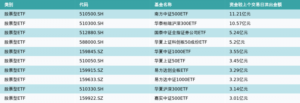 9月25日,股票型ETF资金流出最多的3支ETF及其流入金额分别为:南方中证500ETF(流出11.21亿元)、华泰柏瑞沪深300ETF(流出10.57亿元)、国泰中证全指证券公司ETF(流出5.24亿元)。资金流出前10详情见下表: