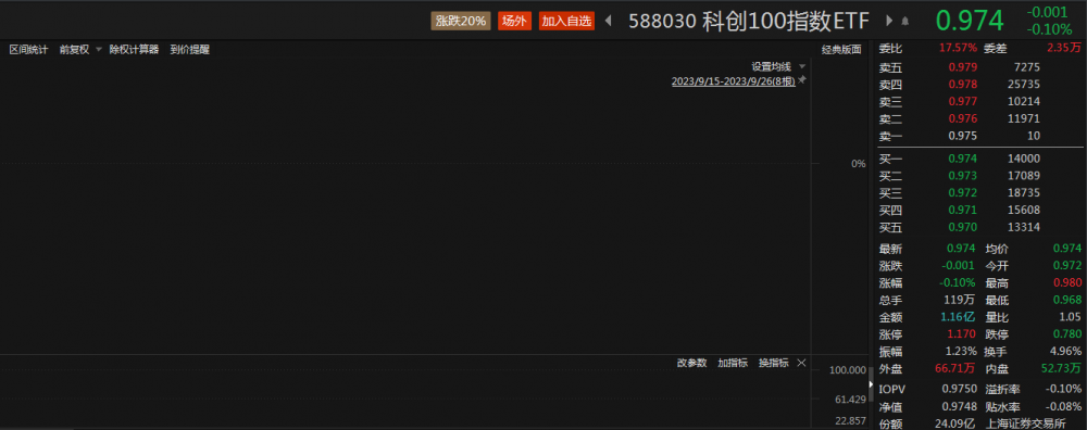 跟踪科创100指数规模最大的ETF--科创100指数ETF(588030)午间收跌0.10%,成交额1.16亿元,换手率4.96%,交投活跃,最新份额超24亿份。
