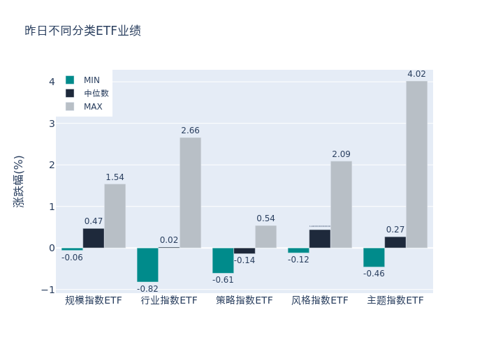 昨日股票型ETF收益率中位数为0.27%。其中按照不同分类,规模指数中国泰上证科创板100ETF收益率最高,为1.54%;行业指数中华夏医药ETF收益率最高,为2.66%;策略指数中南方富时中国国企开放共赢ETF收益率最高,为0.54%;风格指数中嘉实医药健康100ETF收益率最高,为2.09%;主题指数中广发中证光伏龙头30ETF收益率最高,为4.02%。