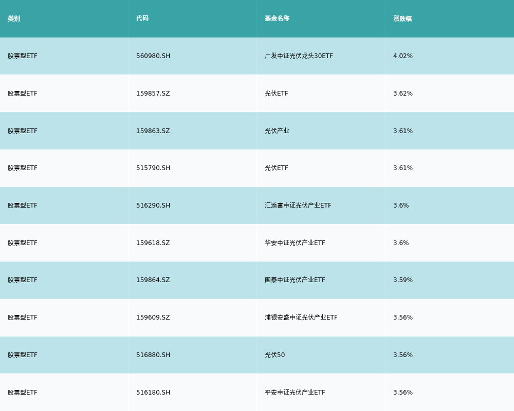 昨日股票型ETF涨幅最高的3支ETF及其收益率分别为:广发中证光伏龙头30ETF(4.02%)、光伏ETF(3.62%)、光伏产业(3.61%)。涨幅前10详情见下表: