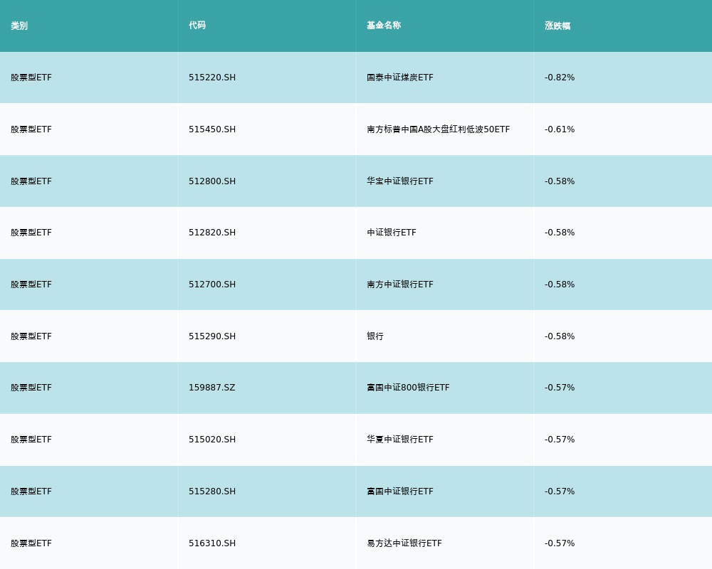 昨日股票型ETF跌幅最大的3支ETF及其收益率分别为:国泰中证煤炭ETF(-0.82%)、南方标普中国A股大盘红利低波50ETF(-0.61%)、华宝中证银行ETF(-0.58%)。跌幅前10详情见下表: