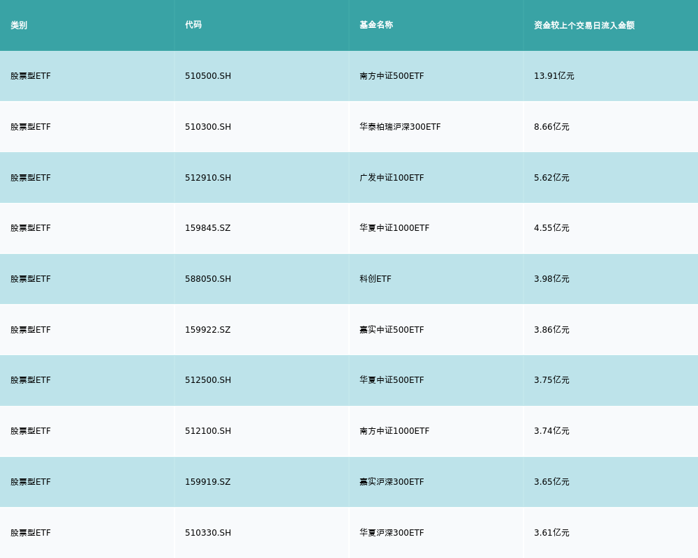 昨日股票型ETF资金流入最多的3支ETF及其流入金额分别为:南方中证500ETF(流入13.91亿元)、华泰柏瑞沪深300ETF(流入8.66亿元)、广发中证100ETF(流入5.62亿元)。资金流入前10详情见下表: