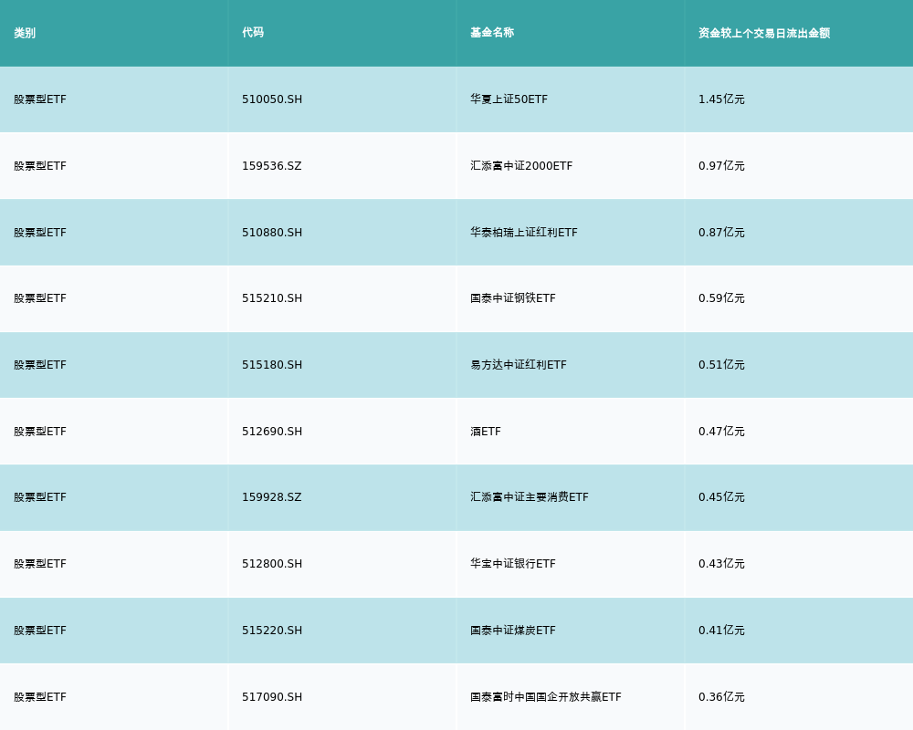 昨日股票型ETF资金流出最多的3支ETF及其流入金额分别为:华夏上证50ETF(流出1.45亿元)、汇添富中证2000ETF(流出0.97亿元)、华泰柏瑞上证红利ETF(流出0.87亿元)。资金流出前10详情见下表: