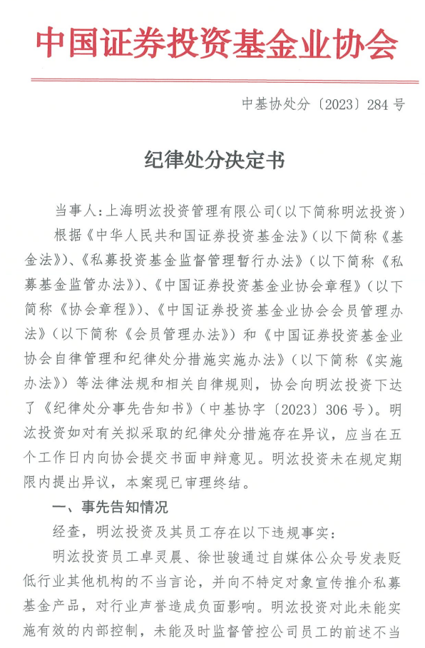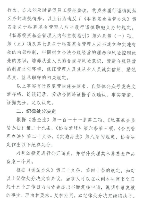 近日,中基协网站公布了对明汯投资的纪律处分决定书,中基协对明汯投资公开谴责,并暂停受理其私募基金产品备案三个月。中基协认为明汯投资未对员工通过自媒体号发表不当言论等问题进行有效内部控制,未能及时监管公司员工不当行为,亦未能及时督促员工规范整改,构成未履行谨慎勤勉义务。