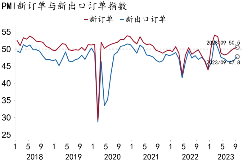 9月制造业PMI环比连续第四个月回升,但仍低于疫前三年(2017-2019年)同期均值。产需两端景气度均有改善,生产修复持续快于需求。在生产端,9月生产指数环比回升0.8pct至52.7%,连续第四个月位于扩张区间。在需求端,内外需景气度保持分化。新订单指数环比上升0.3pct至50.5%,连续第二个月位于扩张区间,内需修复动能稳步改善;出口订单指数环比回升1.1pct至47.8%,连续六个月位于收缩区间,出口增速下行压力仍在加大。