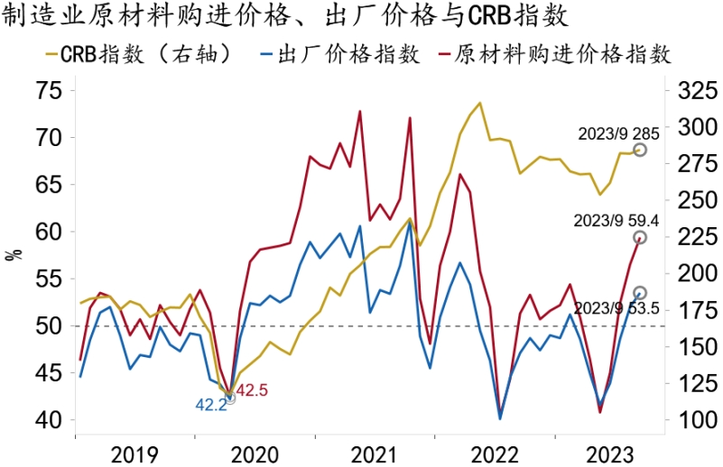 价格指数环比持续回升,推高企业成本压力。部分大宗商品价格持续上涨,9月原材料价格指数环比上升2.9pct至59.4%,连续第三个月位于扩张区间。需求修复动能持续改善推动出厂价格指数连续第四个月环比回升1.5pct至53.5%,连续第二个月位于扩张区间。