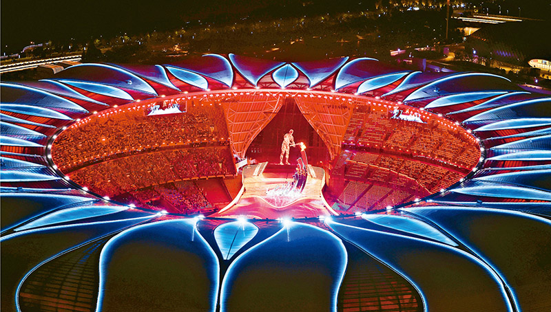 2023年9月23日,第19届亚洲运动会开幕式在杭州举行。图为最后一棒火炬手汪顺和“数字火炬手”在开幕式上点燃主火炬。 新华社记者 程婷婷/摄