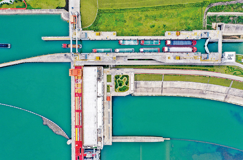 2023年9月2日,大藤峡水利枢纽最后一台机组正式投产发电,标志着主体工程顺利完工。图为大藤峡水利枢纽船闸。 新华社记者 曹祎铭/摄