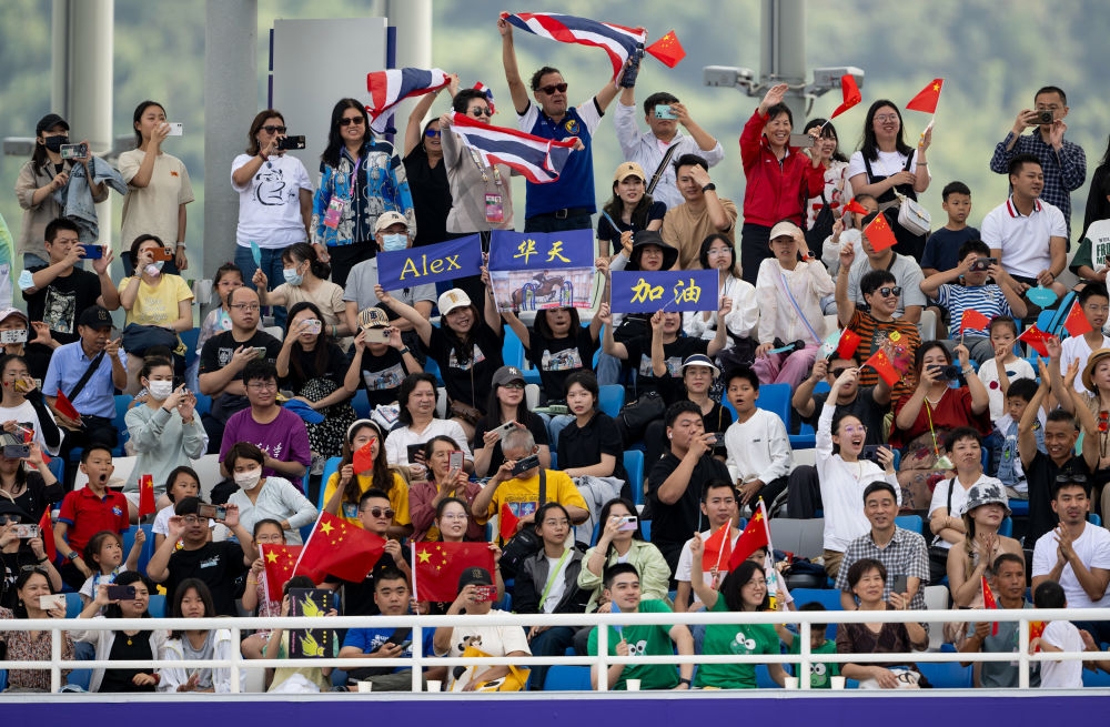 桐庐马术中心当天风清气朗,观众们在坐席上挥舞着手中的五星红旗,尽情庆祝这场来之不易的胜利。