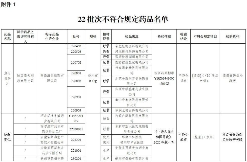一、经海南省药品检验所检验,标示为陕西海天制药有限公司生产的7批次血府逐瘀片不符合规定,不符合规定项目为鉴别。