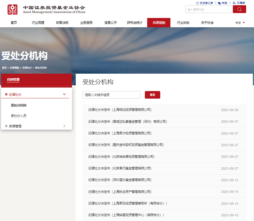 9月27日,协会网站公示了多张针对私募机构的纪律处分决定书,君信达私募基金管理(深圳)有限公司、上海泉汐投资管理有限公司在内的五家私募被罚。