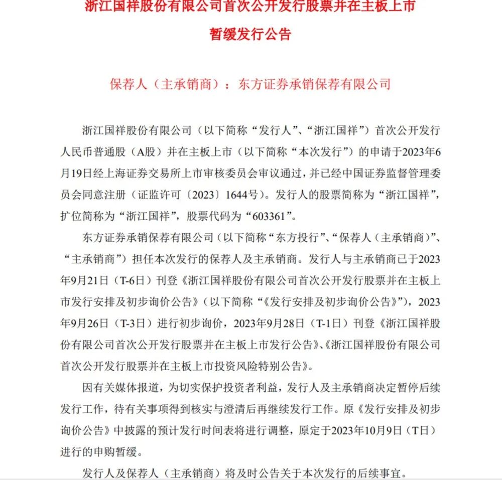 在公告中,浙江国祥表示,原《发行安排及初步询价公告》中披露的预计发行时间表将进行调整,原定于10月9日(T日)进行的申购暂缓。发行人及保荐人(主承销商)将及时公告关于本次发行的后续事宜。