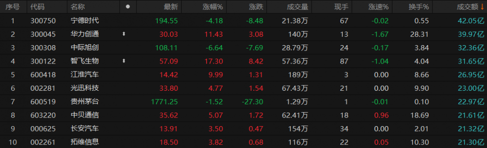 沪深两市半天成交额4883亿元,较上一交易日同期放量628亿元。个股方面,截至午间收盘,宁德时代成交额排名第一,达42.05亿元;华力创通、中际旭创、智飞生物成交额也在30亿元以上,分别为39.97亿元、32.36亿元、31.65亿元。