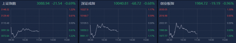 A股早盘走低,三大指数一度均跌超1%,盘中快速回升后再度回落。南财金融终端显示,截至上午收盘,上证指数跌0.69%,深证成指跌0.68%,创业板指跌0.96%。沪深两市个股跌多涨少,近3700只个股下跌。