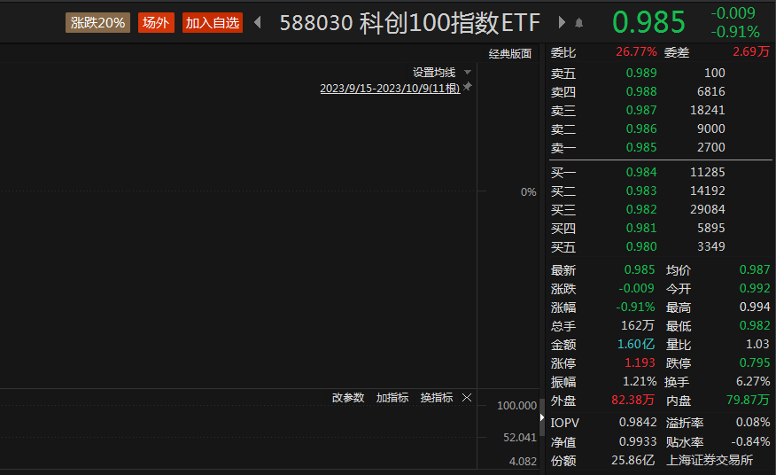 科创100指数ETF(588030)截至早盘收盘收跌0.91%,溢折率0.08%,成交额1.6亿元,上一交易日获近2亿元资金加仓,最新规模25.69亿元,远超同标的其他产品。