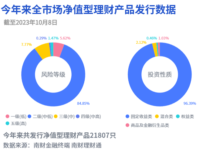 据南财理财通最新数据,截至2023年10月9日,今年来全市场已发行净值型银行理财产品21,807只(含私募产品)。