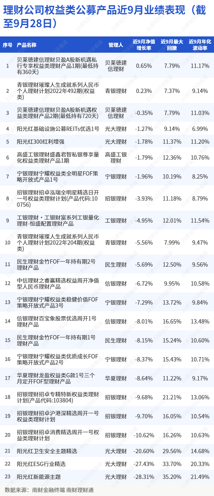权益类公募产品方面,由于产品净值披露时间不一,部分产品未披露9月28日净值,因此课题组以近9月净值增长率替代分析权益类公募产品今年前三季度业绩表现。从榜单可以看出,存续的23只权益类公募产品中仅有贝莱德建信理财的“贝盈A股新机遇私行专享权益类理财产品1期(最低持有360天)”和青银理财的“璀璨人生成就系列人民币个人理财计划2022年492期(权益类)”录得正收益,今年以来收益微涨,其余产品今年前三季度年内收益为负,17款产品跌幅在10%以内,光大理财三款产品收益跌超20%。