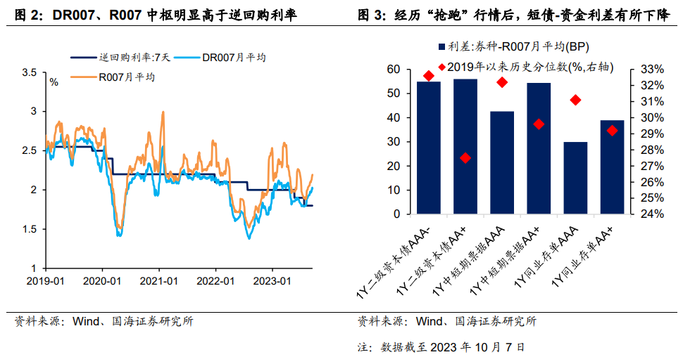 资金利率是否能随着前期债务资金的下拨而重新走低。我们认为,考虑到目前资金利率大幅高于逆回购中枢,以及9月份降准落地反映出央行资金面态度并没有明显收紧,10月份的资金面及短债或存在一定机会。