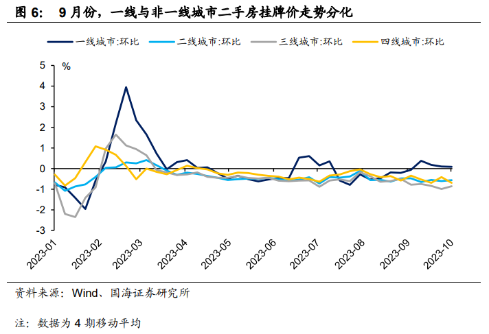 同时在9月10日报告《如何观察本轮稳增长政策效果?》中,我们提出二手房挂牌价或是比30城商品房成交数据更加领先的指标。8月底政策落地后,9月份一线城市二手房挂牌价环比回正,但是三、四线城市挂牌价下跌速度反而加快(图6),反映出本轮政策背景下,高能级城市楼市需求回暖对中小城市楼市需求的“虹吸”效应,这种效应并不利于全国地产数据回升。