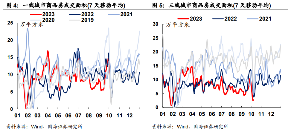 从30大中城市商品房成交面积观察,9月份一线城市商品房成交确实有明显回暖,基本恢复到往年平均水平以上(图4)。然而二、三线城市楼市成交不及预期,依旧不及往年水平,特别是三线城市成交为近年来同期最差(图5),“金九”成色不佳。