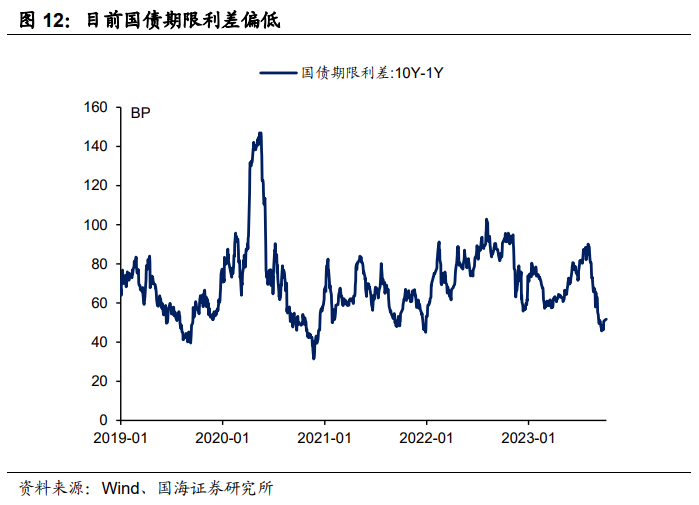同时从期限利差的角度,当前10Y-1Y期限利差位于历史偏低水平,收益率曲线切平(图12)。长债行情启动或需要短债先行,先打开期限利差的空间。因此相关机会仍需等待。