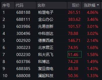 其中,柏楚电子涨超4%、金山办公、兆易创新、中科创达涨超3%,德赛西威、北京君正、科大讯飞等股跟涨。