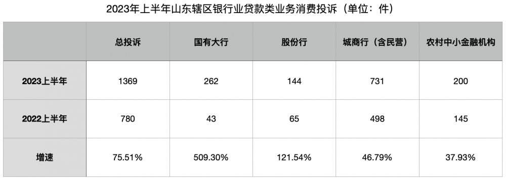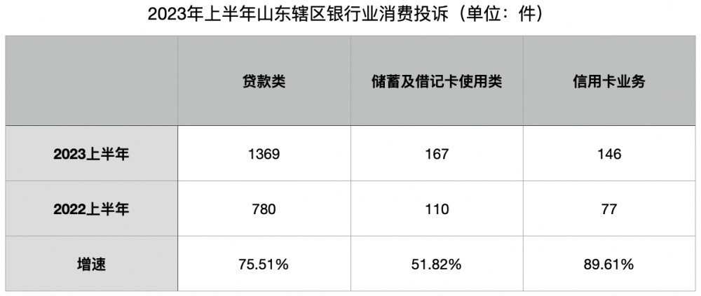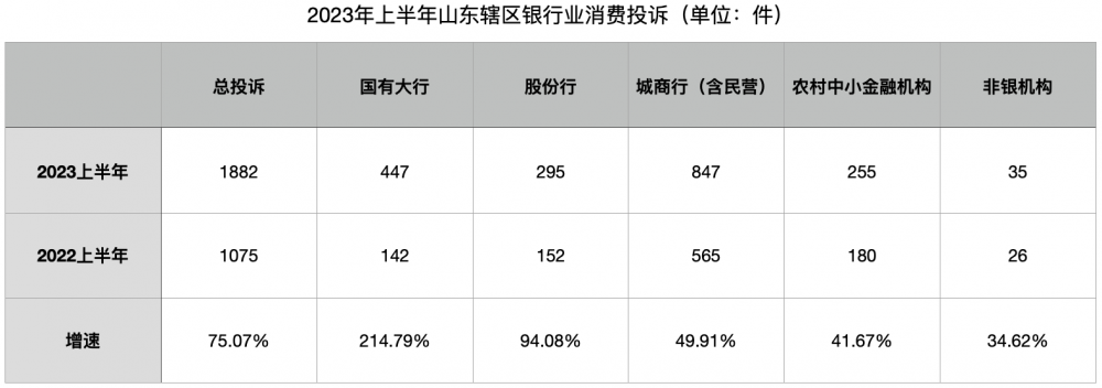 10月8日,国家金融监督管理总局山东监管局发布的2023年上半年辖区银行业消费投诉情况通报显示,上半年辖内银行业消费投诉共计1882件,同比增长75.07%。