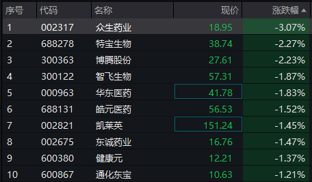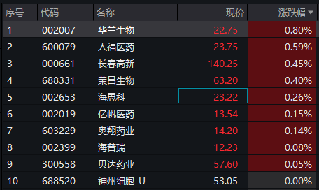 涨幅方面,华兰生物、人福医药、长春高新等股小幅上涨。