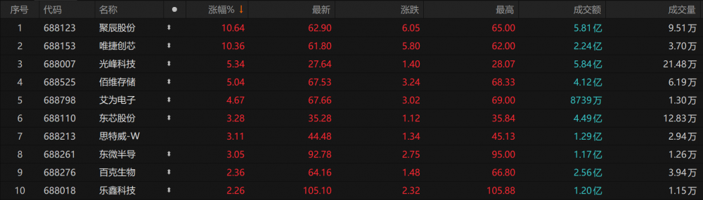 成分股方面,半导体板块集体走强,存储芯片方向领涨,聚辰股份、唯捷创芯涨超10%,光峰科技、佰维存储涨逾5%,艾为电子涨超4%,东芯股份、思特威-W、东微半导涨超3%。
