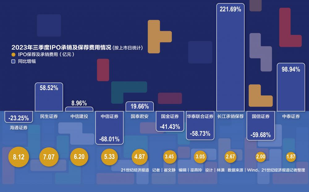 民生证券则较海通证券更胜一筹,是头部券商中唯一一家今年三季度IPO承销及保荐费用环比、同比均为正增长的券商。