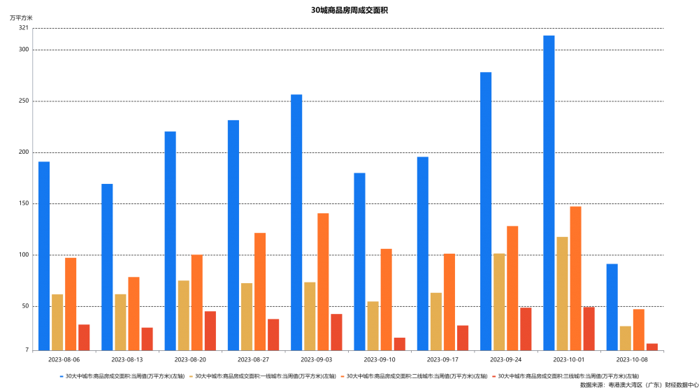 地产销售表现未见明显提振。10月8日当周,30城商品房销售较上周(指10月1日当周,下同)回落较为明显,假期成交热度未有提高,一、二、三线城市环周增速转负,成交规模不及去年同期;二手房方面,全国二手房挂牌量指数环周上涨5.4%至37.7点、低于9月均值水平,挂牌价指数仍延续微降特征,分能级城市中,除四线城市挂牌量环周下降5.1%外,其他能级城市均有不同程度的上涨,其中受上周基数较低影响、一线城市涨幅相对明显,挂牌价指数则普遍下降。土地成交市场整体成交情况未见明显好转。