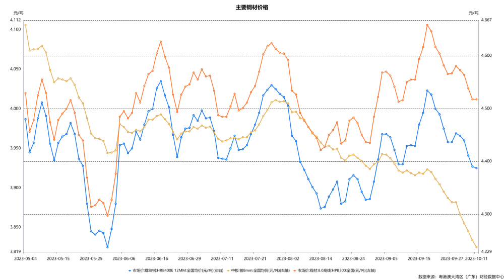 钢材价格普遍回落。10月8日当周,建筑钢材主流贸易商周成交量环周降幅扩大,较去年同期下降了10.8%,成交情况受假期影响相对明显;库存方面,主要钢材品种社会库存水平有所上升、较上周下降4.6%至1128.4万吨,其中螺纹钢社会库存水平及总库存水平均增加,分别较上周上升4.7%和8.5%;主要钢材制品价格普遍微降,10月8日当周,螺纹钢、线材、热轧、冷轧及中板价格分别较10月1日当周变化了-0.2%、-0.3%、-0.9%、0.1%及-0.9%。