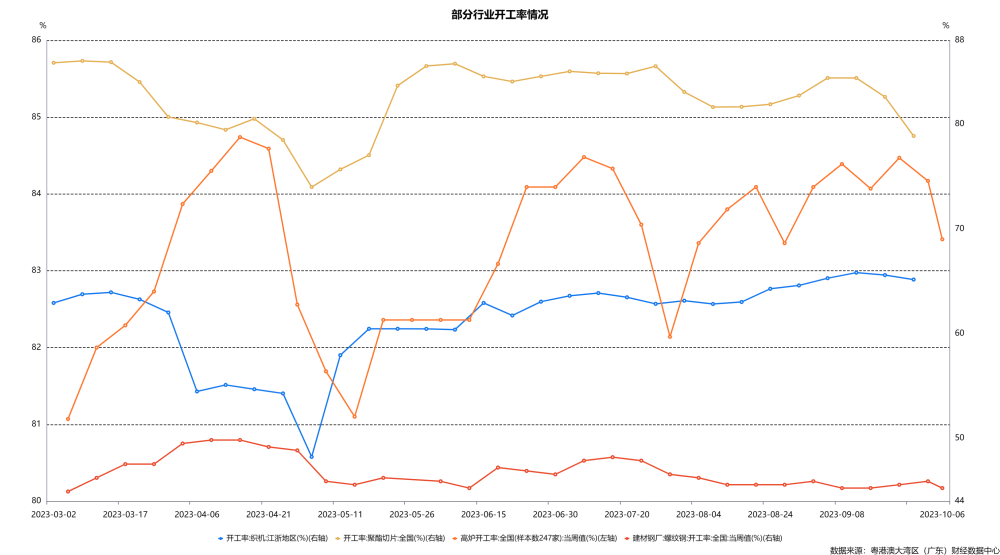 螺纹钢周产量持续回落、轻纺城成交量继续走强。10月8日当周,高炉开工率微降至83.4%、维持相对高位,基本持平于去年同期水平。螺纹钢建材钢厂开工率于上周小幅回落,周产量较上周下降3.5%至254.3万吨;冷轧板卷钢厂开工率上涨2.1个百分点,线材及中厚板钢厂开工率分别较上周下降0.6和1.5个百分点。化工方面,受双节放假影响,10月8日当周,中国轻纺城周合计成交量大幅回落至相对低位规模;截至9月29日,节前下游江浙地区织机和涤纶长丝开工率双双回落、但仍维持相对高位水平,上游聚酯切片开工率下降3.7个百分点;10月8日当周,PTA开工率周内持续小幅回落至77.4%,纯碱开工率则较上周上涨2.0个百分点至88.2%、达近两个月来的高位水平。
